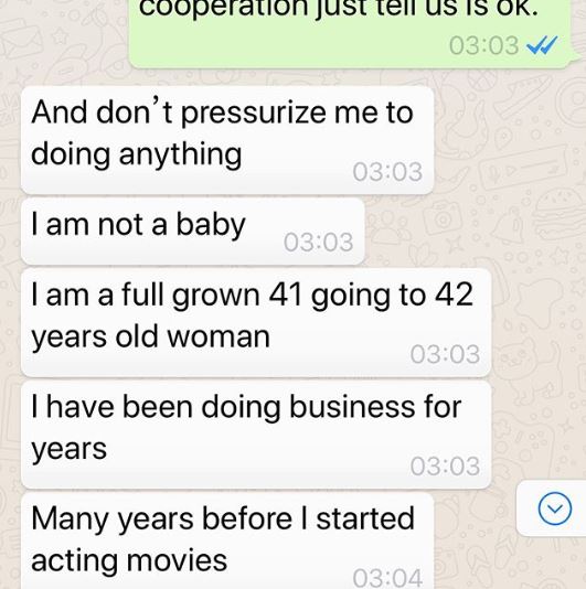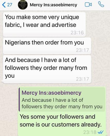 While details of what actually transpired between the aggrieved seller and the Nollywood actress is a bit sketchy, the numerous screenshots of their conversation shared by the fabric seller, suggests Mercy Aigbe neither advertised their business on her page as agreed nor pay for some fabrics.