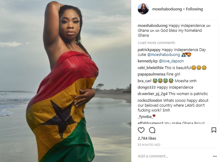Curvy Ghanaian Actress, Moesha Boduong looks extremely sexy in a new photo showing her sexy body covered with Ghana’s flag. She shared the picture in celebration of Ghana’s independence. She wrote