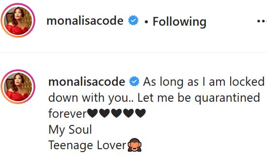 Taking to Instagram today June 28, she wrote; ”As long as I am locked down with you.. Let me be quarantined forever