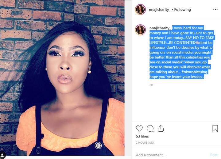The actress who revealed that she works hard for her money and have gone through a lot to get to where she is now, told her fans that they might be better than the celebrities they see on social media. Nnaji Charity who called out Okoro Blessing, wrote;