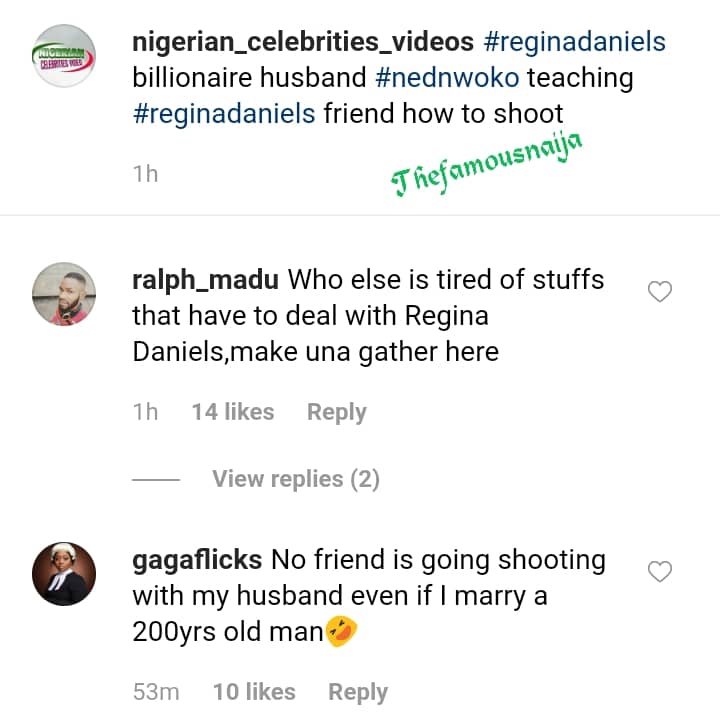 Here is a video of Regina Daniels’ billionaire husband, Ned Nwoko teaching a young lady how to shoot gun.