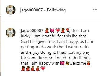 In an Instagram post, Jago as he’s fondly called wrote, ‘I feel I am lucky. I am grateful for this life that God has given me. I am happy, as I am getting to do work that I want to do and enjoy doing it. I had lost my way for some time, so I need to do things that I am happy with welcome”.