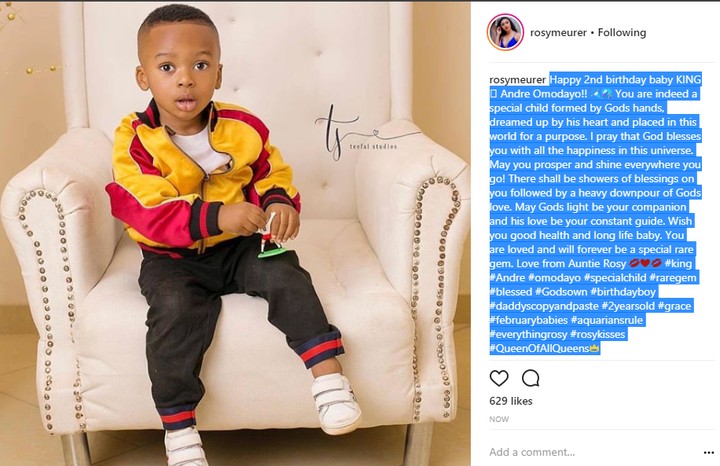 Alleged side chick and actress, Rosy Meurer, who was dragged to the center of Tonto Dikeh’s marital crisis with Olakunle Churchill which led to the dissolution of their marriage, took to Instagram to wish Tonto Dikeh’s son, King Andre Omodayo, a happy birthday.