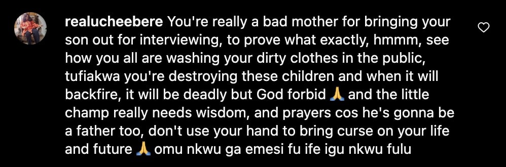 “You’re really a bad mother for bringing your son out for interviewing, to prove what exactly, hmmm, see how you all are washing your dirty clothes in the public, tufiakwa you’re destroying these children and when it will backfire, it will deadly but God forbid and the little champ really needs wisdom, and prayers cos he’s gonna be a father too, don’t use your hand to bring c rse on your life and future omu kwu ga emesi fu ife igu nkwu fulu”