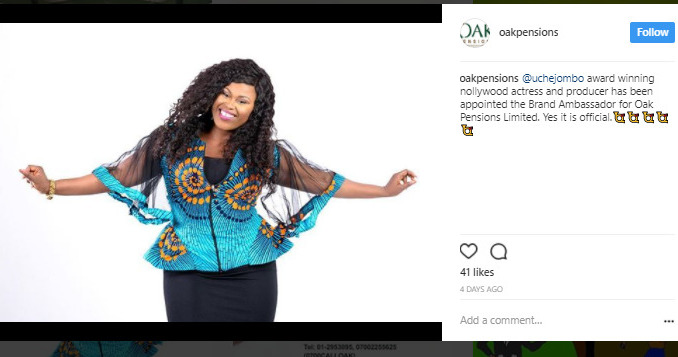 Nollywood actress, Uche Jombo, has just landed herself another endorsement deal as the actress has been appointed as the brand ambassador for Oak Pensions Limited.