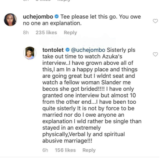 Reacting to their rift, Uche Jombo advised Tonto to let it go as she owes no one any explanation… She wrote;