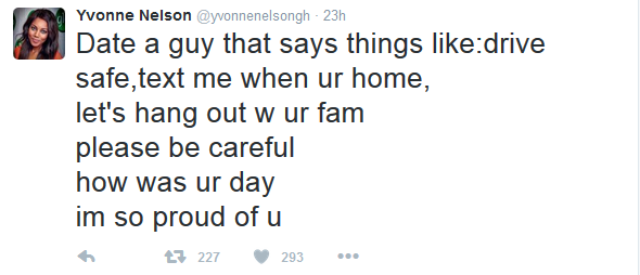 Ghanaian actress, Yvonne Nelson took to twitter to talk about relationships and gave advice on the kind of men ladies should date