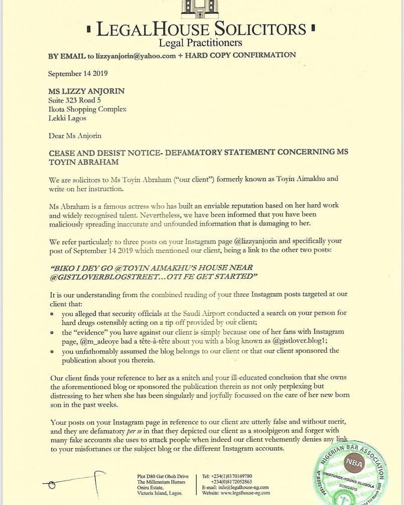 Actress Toyin Abraham has through her lawyer asked Lizzy Anjorin to apologize within 24 hours or risk going to jail.