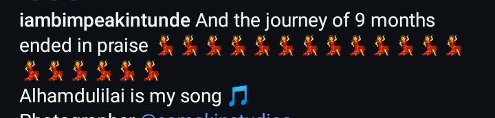 Her post reads,“And the journey of 9 months ended in praise 💃💃💃💃💃💃💃💃💃💃💃💃💃💃💃💃💃.Alhamduliah is my song”.