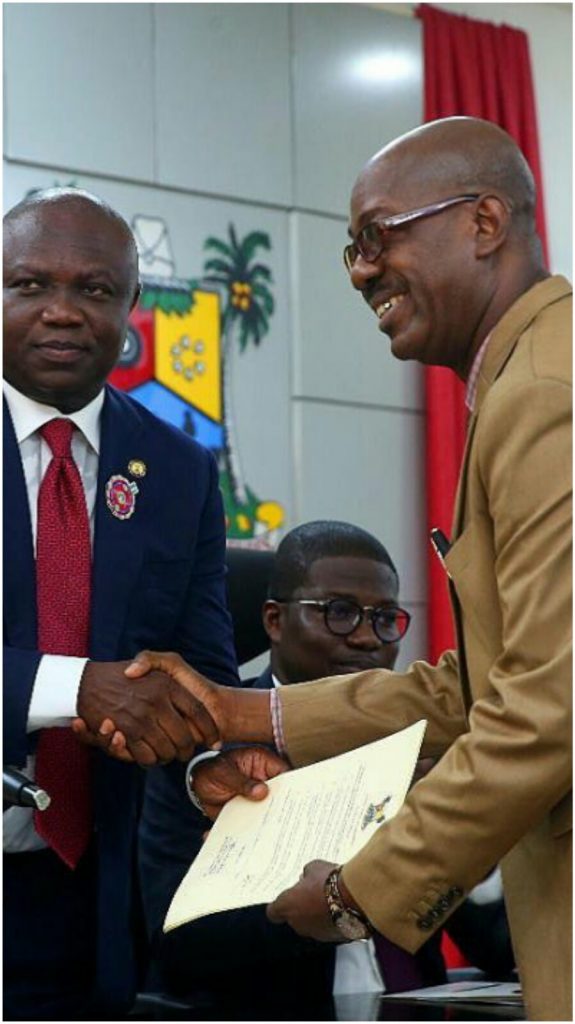 Adekunle Gold cries out as his father pictured with Lagos State governor, Ambode.