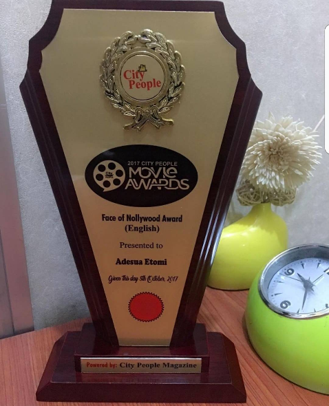 Nigerian Actress Adesua Etomi took to her IG page to share a photo of her latest award as she was awarded the Face of Nollywood at City People Movie Awards which held on Sunday, October 8th at Balmoral event centre, Oregun, Ikeja, Lagos.
