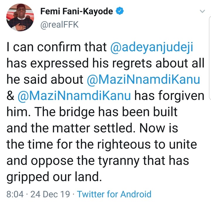 Just been announced by Chief Fani Kayode that both Nnamdi Kanu and Adeyanju have settled their long running feud.