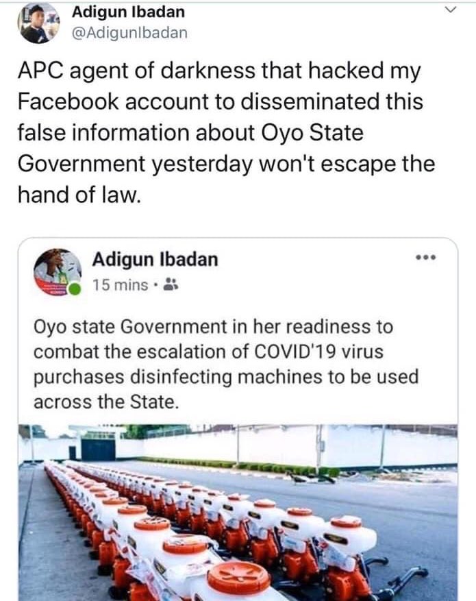 Oyo State Governor – Seyi Makinde sacks special assistant on digital media – Adigun Ibadan ,after posting what seems to be fumigation machines belonging to the Lagos State government claiming it’s credit for Oyo State.