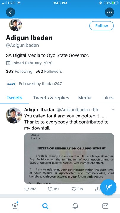 I wish to convey the approval of his excellency, Governor Seyi Makinde, on the termination of your appointment as Special Assistant (Digital Media), with immediate effect.