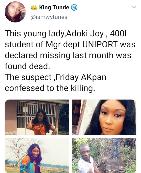 A Twitter user, King Tunde @iamwytunes has shared more photos of the young lady identified as Joy Adoki, a UNIPORT student who was murdered alongside other two guys.