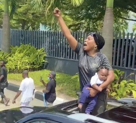 The nursing mom can be seen raising her hand to show support against police brutality in the country.