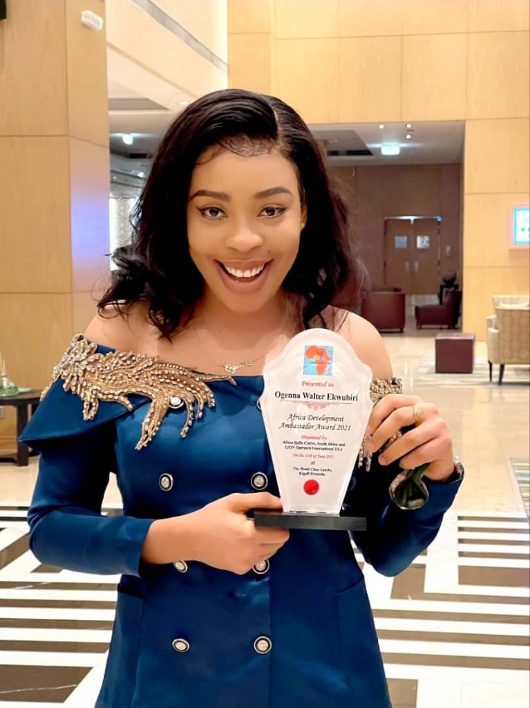 The African Development Ambassador Award 2021 has honoured and recognised Ogenna Walter Ekwubiri for her efforts and impact in eradicating poverty in Africa through her NGO, known as Motivating African Youths Initiative (MAY-I). She was honoured alongside several notable Personalities across Africa few days ago at Kigali in Rwanda.