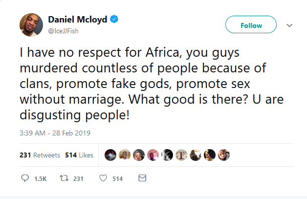 I have no respect for Africa, you guys murdered countless of people because of clans, promote fake gods, promote sex without marriage. What good is there? U are disgusting people!