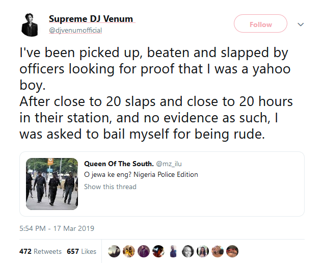 According to the man with the handle @djvenumofficial, he was initially picked on the suspicion he was a yahoo boy, but after interrogation and severe beating, it was proven that he was not into frauds, but was still detained for 20 hours.