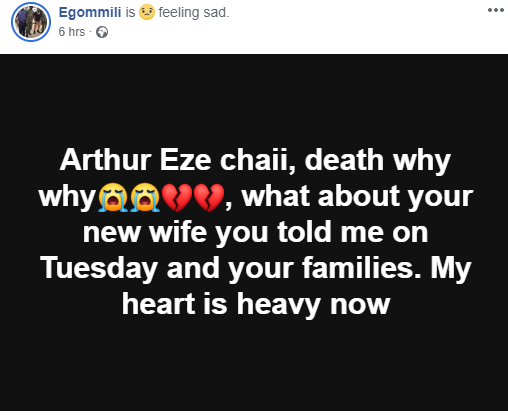 “Going back to Nigeria for the first time after 9 years and you guys killed him in his house.He suffered and slept outside for year and finally made it and go home only to met his death. My man my man. What a world. Arthur Eze rest in peace. Those assassins that murdered you last night will surely give account to God. Nigeria is not safe any more. We are expecting you to come back to Malaysia and this is what we got this morning. May your soul R.I.P”