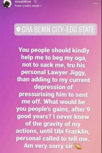 Davido’s lawyer also gave a hint that Isreal will soon be sacked. Getting a hold of that, Isreal has now publicly apologized and wants his boss to forgive him.