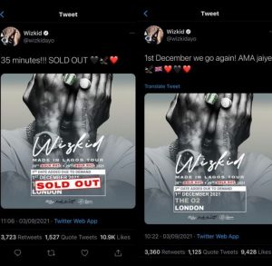 Wizkid gave the update in a tweet, he wrote: ” 35 minutes!!! SOLD OUT!”