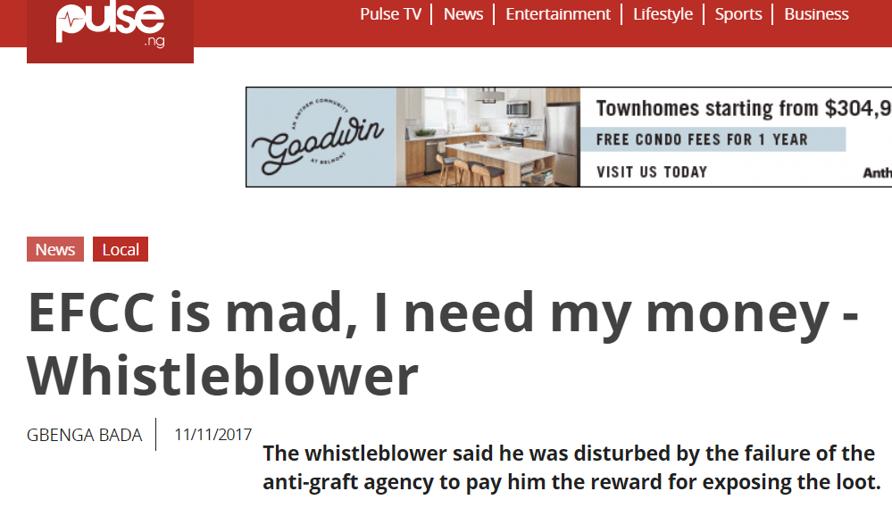 A whistle-blower, John Okupurhe, has written a letter to the President, Major General Muhammadu Buhari (retd), accusing the Office of the Attorney General of the Federation of refusing to pay him commission after exposing over $1bn (N420bn) hidden in Unity Bank Plc.