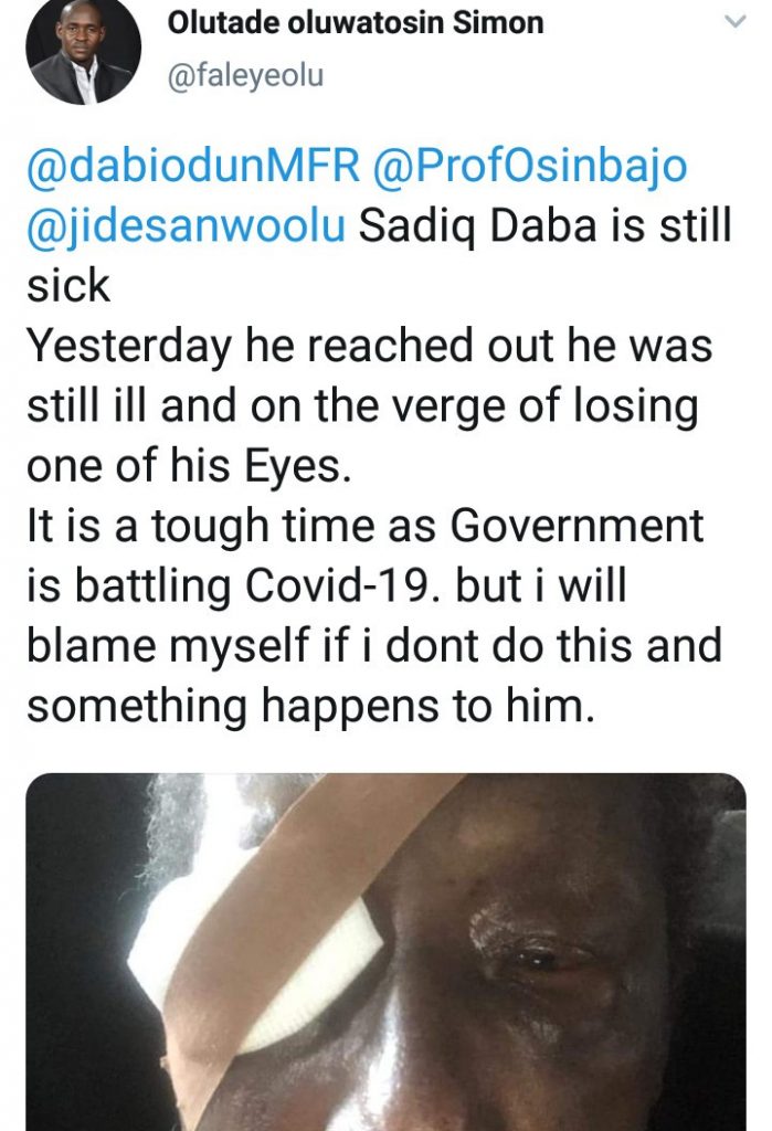 Olutade Simon, a journalist, took to Twitter to ask for help for the ailing actor and begged that this help is needed urgently.