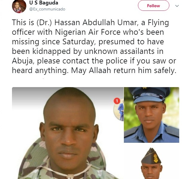 Hassan Abdullah Umar an Officer of the Nigeria Air Force has been declared Missing, And presumed to have been kidnapped, Though how it happened is yet to be known, But his friends and family has been crying out on their Social Media Pages..