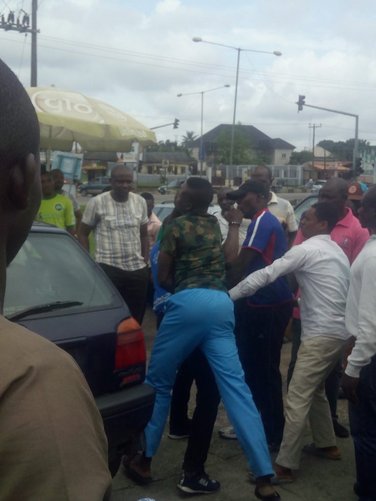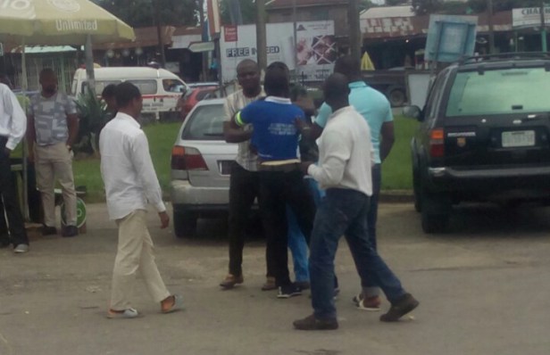 The Air force officer had to call his colleagues on phone to come to his aid. His colleagues arrived the scene as they descended on the tax force men, but the guy that started the fray was nowhere to be found.
