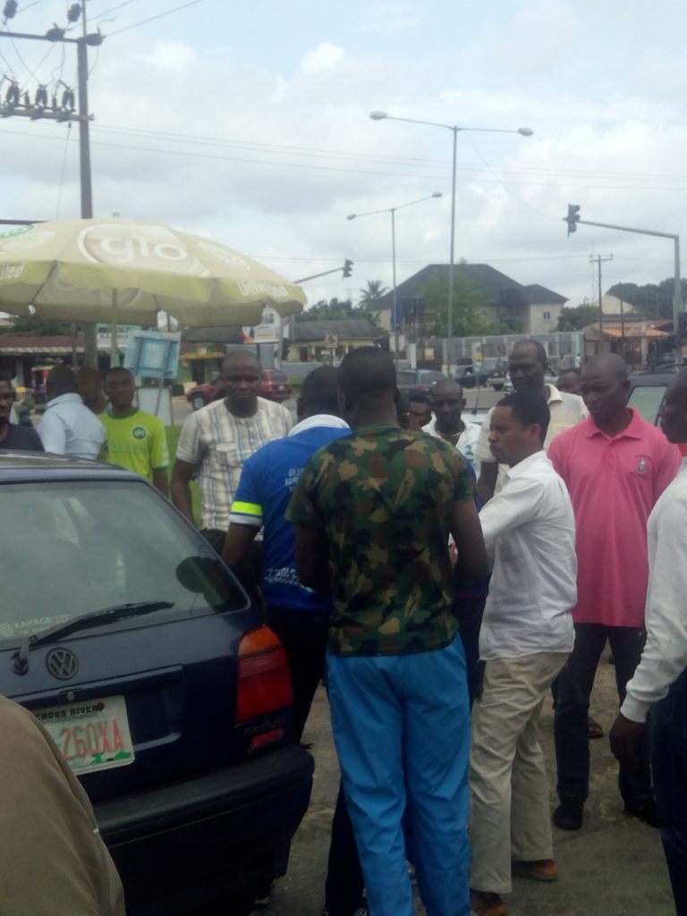 A group of tax force officials were beaten earlier today in Calabar, Cross River State Capital city by some officers of the Nigerian Air force. The incident which reportedly happened at the popular Mobil filling station saw an Air force Officer descend on the tax force as they were about towing a Volkswagen Golf vehicle for wrong parking.