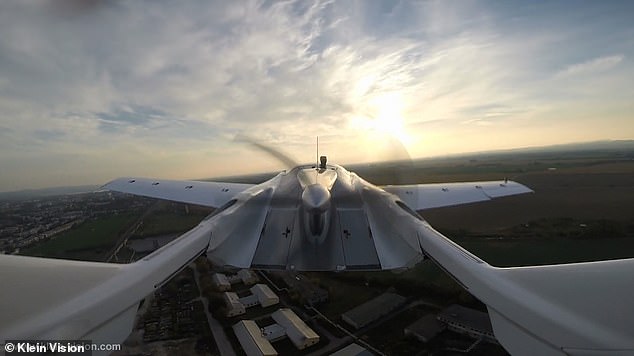 Sensational footage of the AirCar, developed by Slovakian firm KleinVision, shows it driving on a runway, stopping to deploy wings, and then soaring through the air.