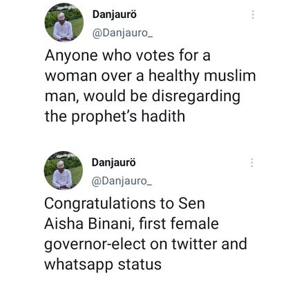 A Nigerian man identified as Danjauro has stated that anyone who votes a woman over a healthy Muslim man, would be regarding the Prophet’s hadith.