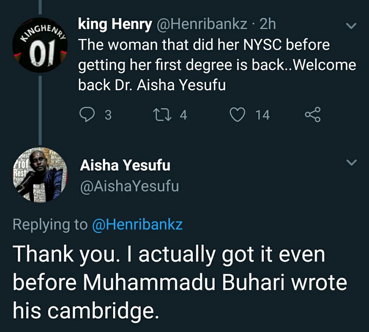 A follower just went and commented “the woman that did her NYSC before getting her first degree is back..Welcome back Dr. Aisha Yesufu.