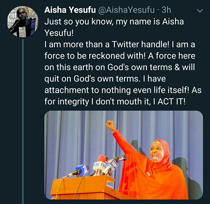 She shared a post saying. “Just Know may name is A’isha Yesufu i am more than a Twitter handle! I am a force to be reckoned with! A force here on earth on God’s own terms & will quit on God’s own terms. I have attachment to nothing even life itself! As for integrity i don’t mouth it, I Act It!”
