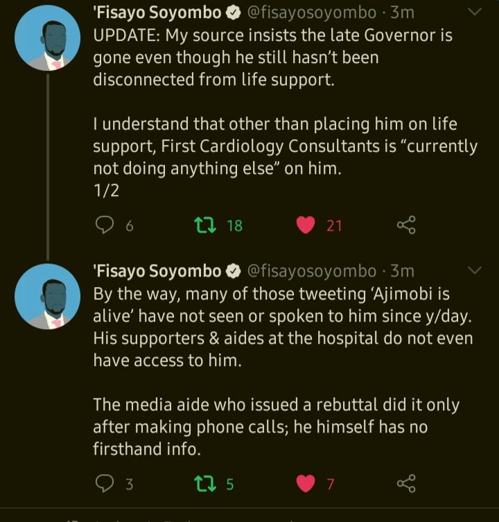 By the way, many of those tweeting ‘Ajimobi is alive’ have not seen or spoken to him since y/day. His supporters & aides at the hospital do not even have access to him.