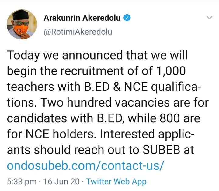 Governor Akeredolu who made the announcement via his twitter account, said two hundred (200) vacancies are for candidates with Bachelors in Education(B.ED), while eight hundred (800) are for NCE holders.