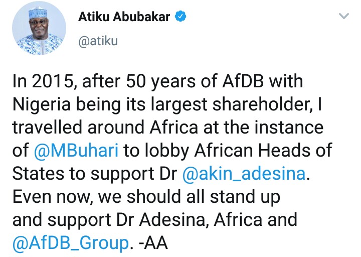 Former Vice-President and PDP 2019 Presidential flag bearer, Atiku Abubakar rallies support for AfdB President, Adesina.