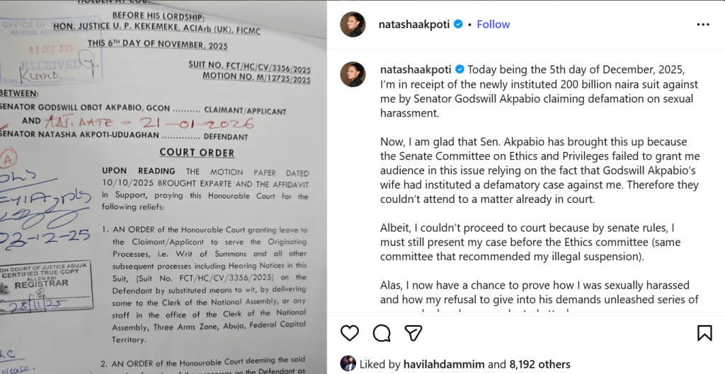 Senate President Godswill Akpabio has filed a two hundred billion naira defamation suit against Senator Natasha Akpoti Uduaghan of Kogi Central over sexual harassment allegations she made against him.
