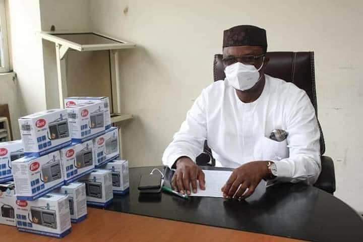 Below are pictures of the commissioner for Information and Technology distributing transistor radios to some beneficiaries, likely the staffers of the ministry.