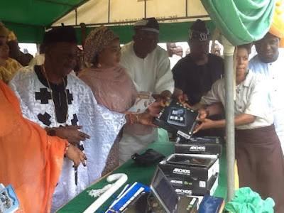 Alaafin of Oyo, Oba Adeyemi III and his three wives pictured yesterdday at the distribution of educational tablets sponsored by Prince Akeem Adeyemi, the lawmaker representing Oyo Federal Constituency at the National Assembly, Abuja. See more photos after the cut…
