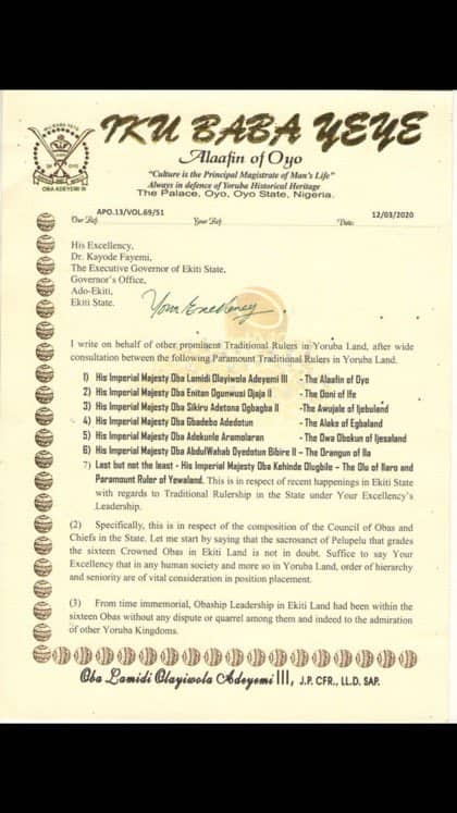 Alaafin Writes Fayemi, Asks Him To Stop Actions Against Traditional Rulers