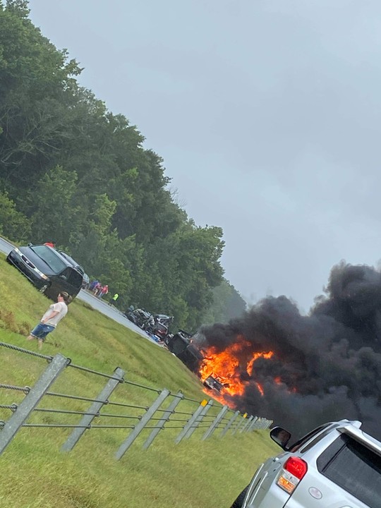 Authorities said the crash took place Saturday about 35 miles (55 kilometers) south of Montgomery on Interstate 65 when the vehicles likely hydroplaned on wet roads caused by the storm.