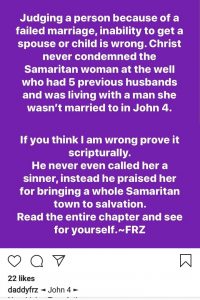 He added that it’s not scriptural to mock the divorced, single and barren.