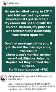 He pointed out that Albert Einstein was divorced and the richest man in the world Jeff Bezos is also divorced yet it didn’t stop them from fulfilling purpose.