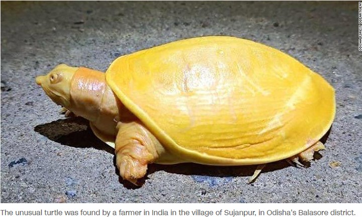 A farmer in eastern India has found a yellow turtle which experts say is the product of albinism.