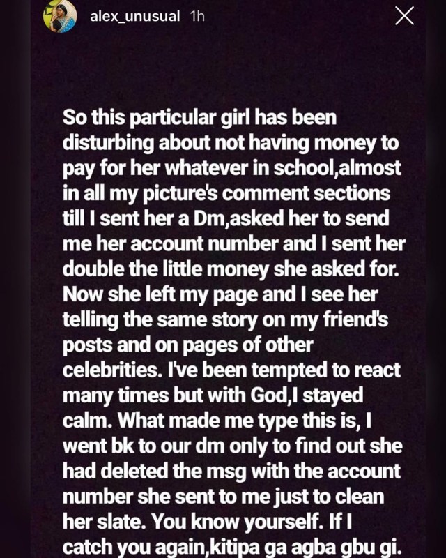 So this particular girl has been disturbing about not having money to pay for her whatever in school, almost in all my picture’s comment sections till i sent her a DM, asked her to send me her account number and i sent her double the little money she asked for. Now she left my page and i see her telling the same story on my friend’s posts and pages of other celebrities. I’ve been tempted to react many times but with God, i stayed calm. What made me type this is , i went bk to our dm only to find out she had deleted the message with the account number she sent to me just to clean her slate. You know yourself. If i catch you again, Kitipa ga agba gbu gi.
