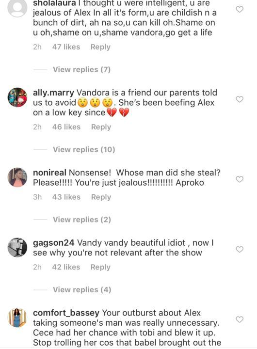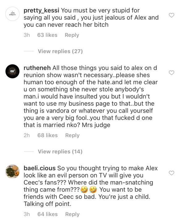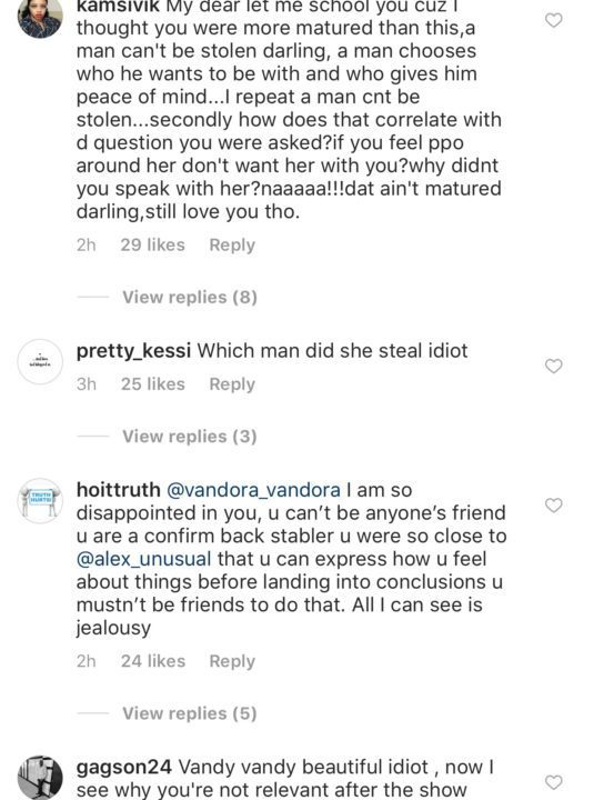 Recall that Vandora who spoke on the concluding part of the show yesterday, said she can’t be friends with Alex because she can’t trust her. She further accused Alex of stealing Cee-C’s man. Alex’s fans who dragged Vandora for calling her a ‘man thief’, accused her of being jealous. Here is the video and reactions to it below;