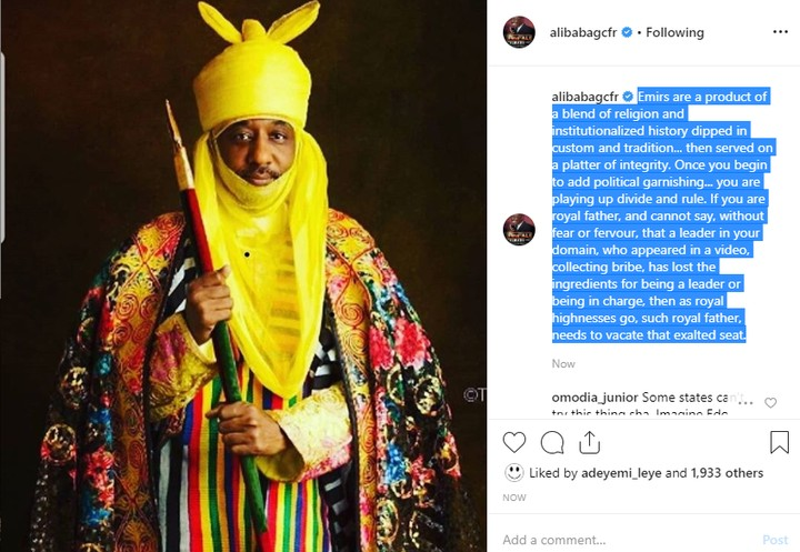 Alibaba who recounted how Ganduje took bribe as he reacted to report of the Kano Governor splitting Emir Sanusi’s kingdom, stated that Emirs are a product of a blend of religion and institutionalized history dipped in custom and tradition. He further added that if a royal father cannot say without fear or fervour that a leader in his domain, who appeared in a video collecting bribe has lost the ingredients for being a leader or being in charge, then he needs to vacate the exalted seat.