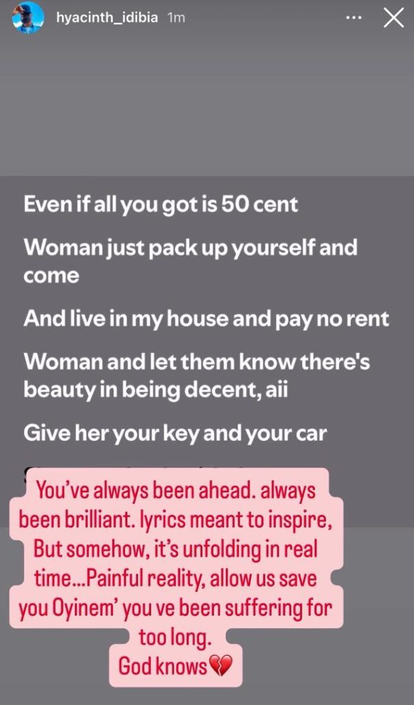 This morning, Hyacinth took to his Instastories to appeal to his brother to allow them save him. He shared an audio recording of a song 2Face had recorded speaking about an independent woman who was ‘’chopping” all his money and leaving him with zero balance.